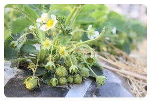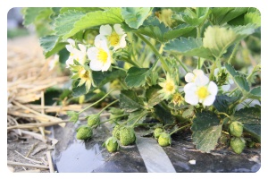 今のいちごの様子です。花が咲いて、緑の小さな実がなりはじめています。