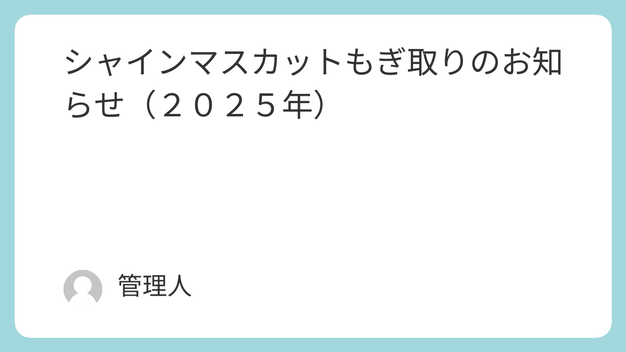 シャインマスカットもぎ取りのお知らせ(2025年) 未分類 2025.08.30 シャインマスカット他のもぎ取り日時が決まりました。9/13(土) 9:00~16:009/14(日) 9:00~16:00 ※13日に売り切れなかった場合のみ ※ ぶどうが無くなり次第終了いたします。※ 混雑状況により早めに開園することがあります。※ 路上駐車は近隣のご迷惑となりますので、お車でお越しの際はコインパーキングをご利用ください。※ 100グラム280円です。 皆様のご来園をお待ちしています。